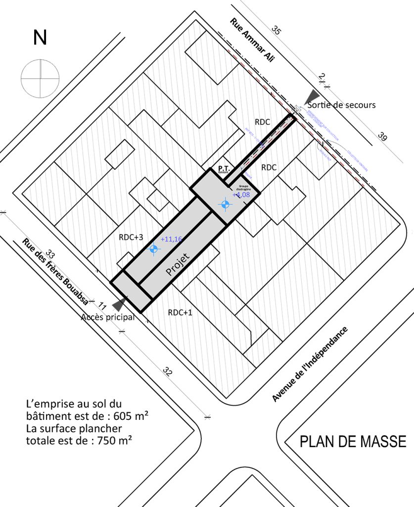 Le 1 er est une structure poteaux-poutres de trois niveaux comprenant le hall d’entrée, le guichet, les sanitaires.